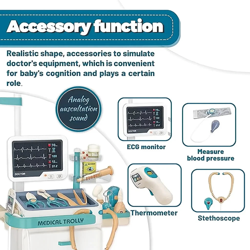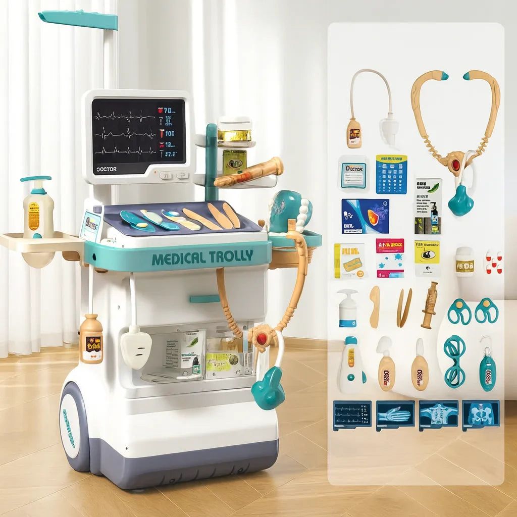 Transformă joaca celor mici într-o experiență educativă autentică! Setul Medical Trolly – 26 PCS este conceput pentru a stimula imaginația copiilor, ajutându-i să înțeleagă mai bine lumea medicală prin joc de rol. Perfect pentru micii doctori dornici să exploreze, să învețe și să se distreze.