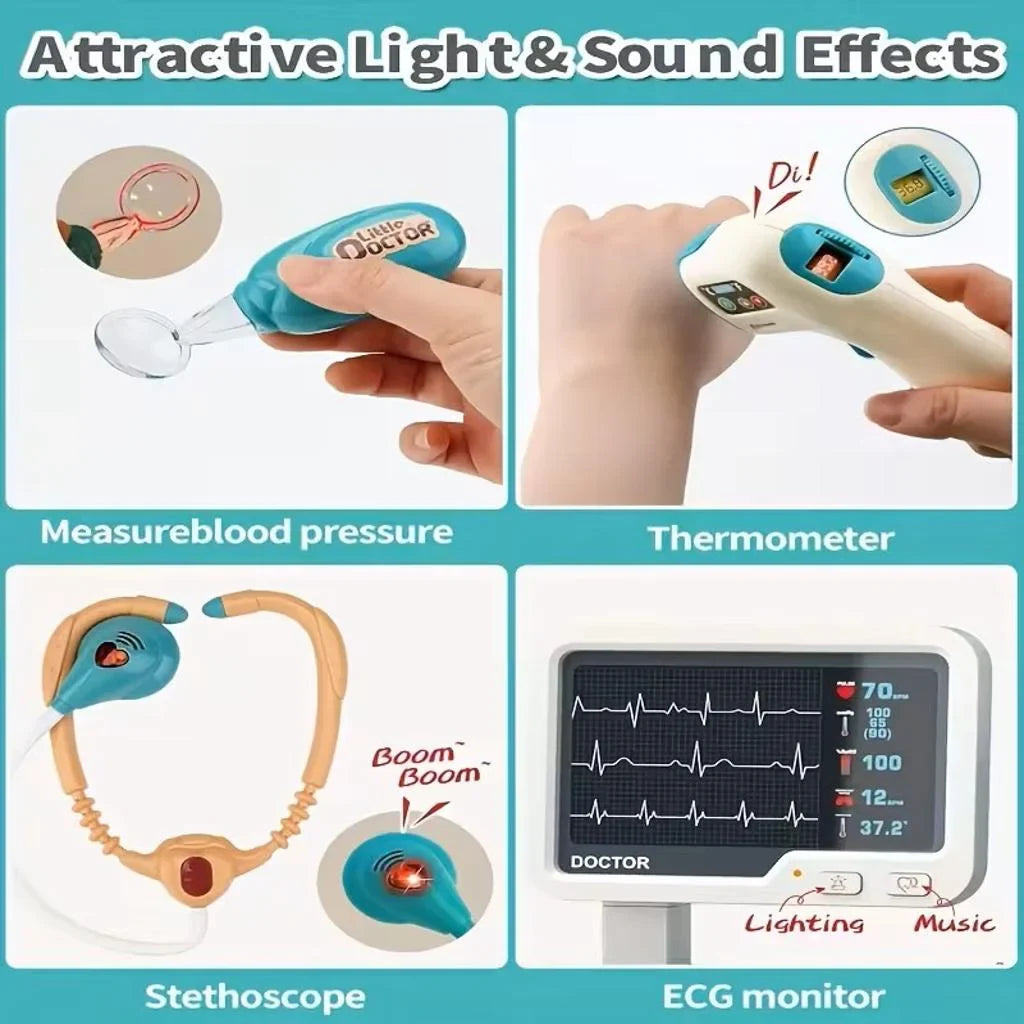 26 de piese realiste – Include stetoscop, termometru, seringi, instrumente medicale, flacoane, rețete, ecografii/X-ray simulate și multe altele.