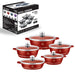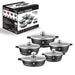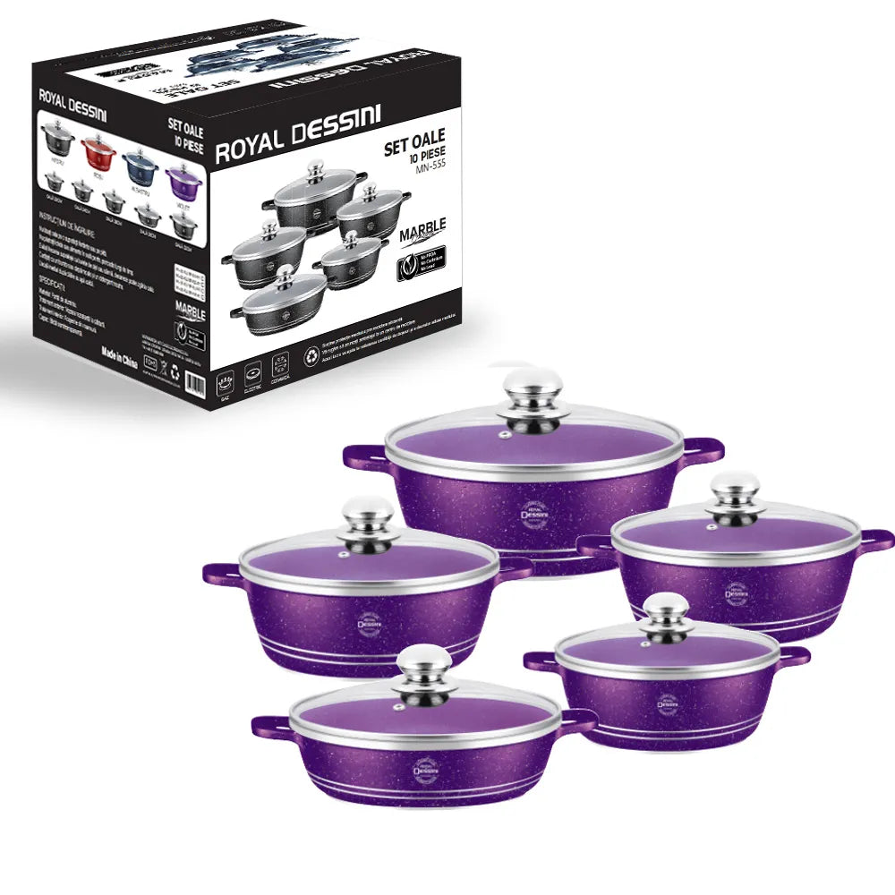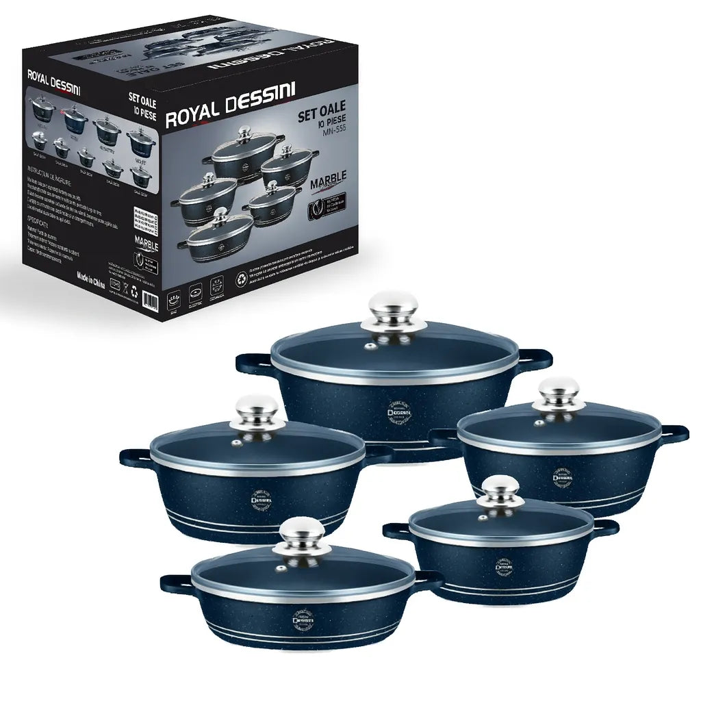 Capacele din sticlă semitransparentă permit monitorizarea preparatelor fără a pierde căldura, contribuind la o gătire mai eficientă. Setul include cinci oale în dimensiuni variate, ideale pentru orice tip de preparat, de la supe și tocănițe până la prăjeli sau garnituri.
