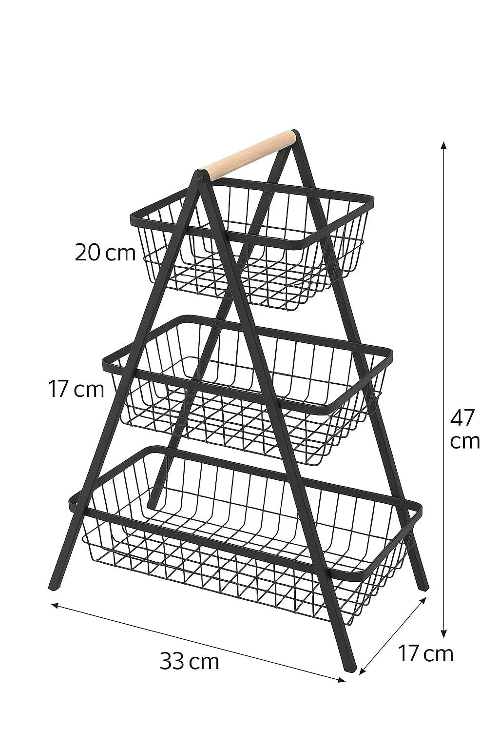 Un coș cu trei niveluri pentru depozitarea fructelor, legumelor și a altor produse de uz zilnic. Construcția metalică solidă pe o bază lată asigură stabilitate ridicată, iar designul tip piramidă economisește spațiu și oferă acces ușor la fiecare nivel. Mânerul confortabil din lemn facilitează mutarea și transportul coșului. Culoarea neagră elegantă se potrivește perfect în orice bucătărie sau interior modern.