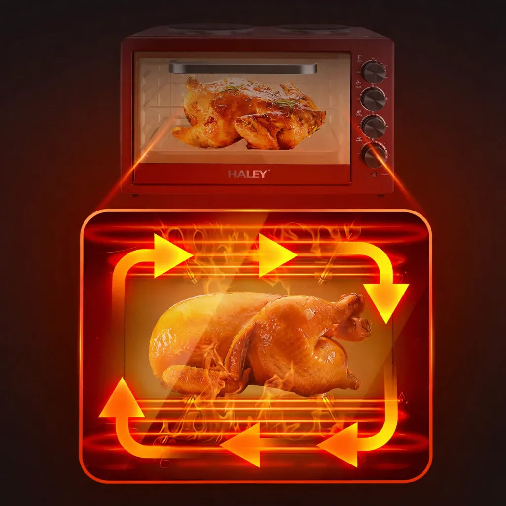 Cuptorul electric HALey HY-5127 este soluția ideală pentru bucătăriile care au nevoie de un aparat compact, dar puternic. Cu o capacitate generoasă de 48 litri și o putere totală de 2000W, acest cuptor îți permite să gătești rapid și uniform o varietate de preparate – de la fripturi și pui la cuptor, până la pizza, prăjituri sau legume coapte.