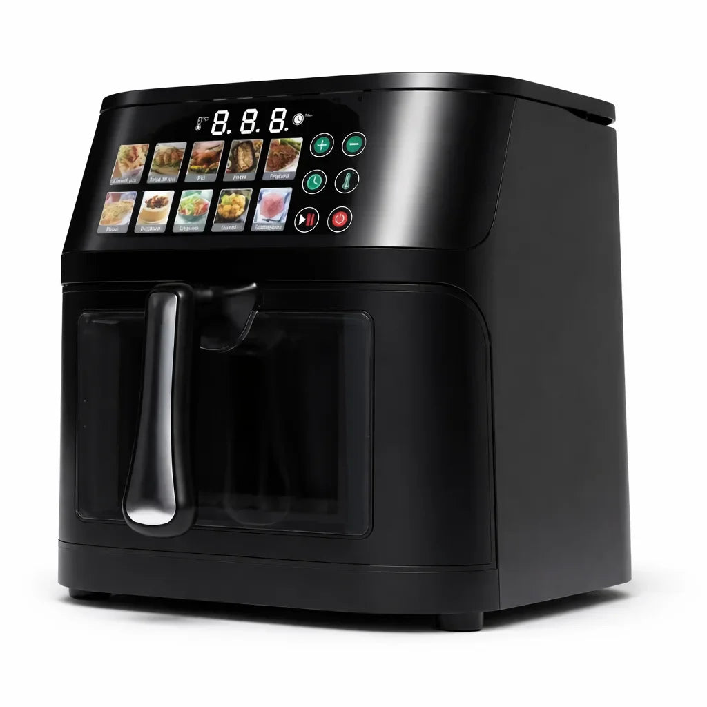 Designul modern, cu panou digital tactil și fereastră de vizualizare, îți permite să urmărești procesul de gătire fără a deschide aparatul. Bucură-te de preparate crocante la exterior și fragede la interior, cu mult mai puțină grăsime față de prăjirea tradițională.
